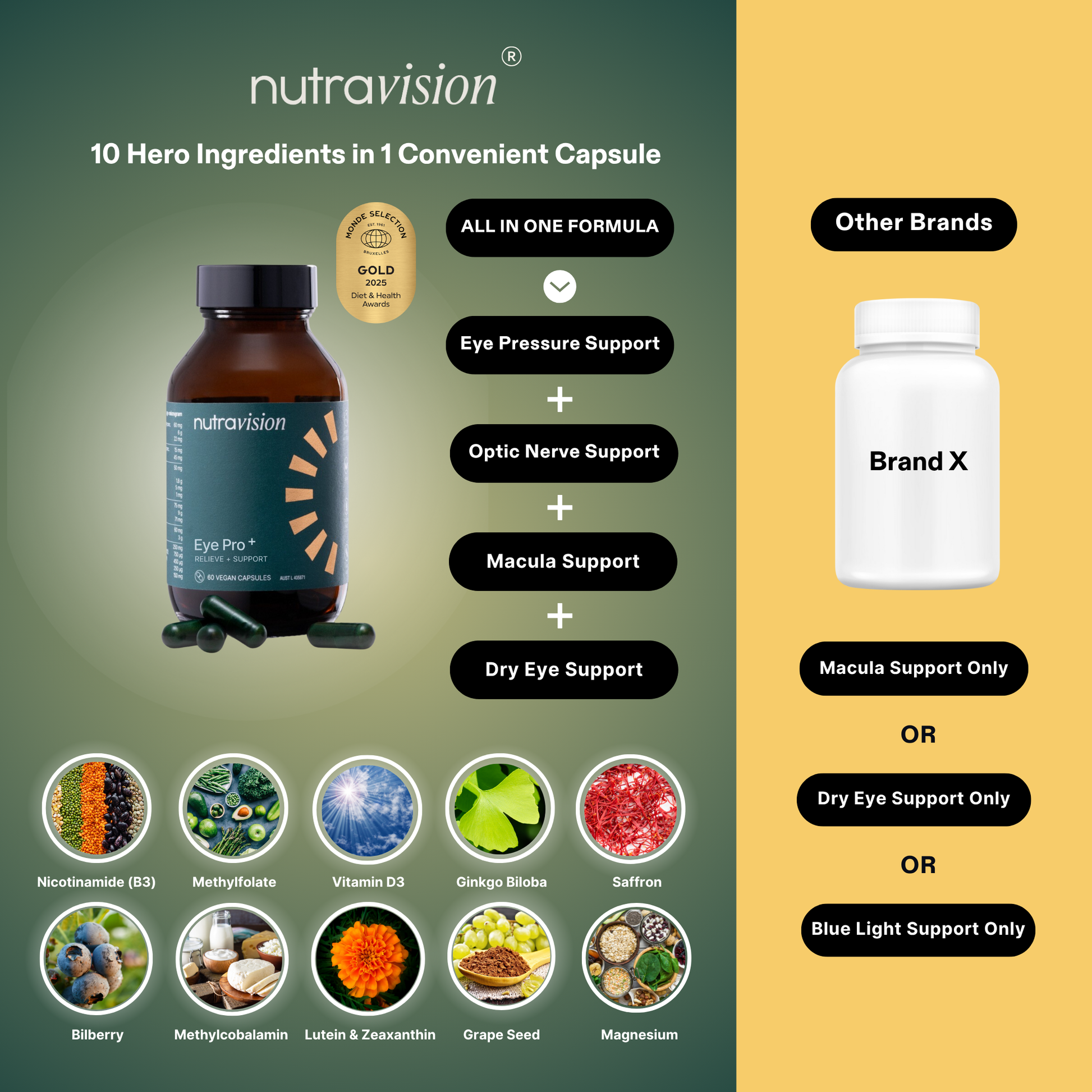 Nutravision is also zinc-free, making it a safer choice for those sensitive to zinc-related macular risks. And with a 2025 Monde Selection Gold Quality Award, you can trust you're choosing a supplement that’s not only expertly formulated — but also internationally recognised for its precision, quality, and safety.